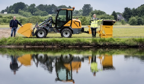 Direktør Helge Godtfeldt (tv) og grundlægger Torben Clausen med den mindste af de tre stirenoveringsmaskiner, TC1. Modellen dækker stier fra 1-1,4 meter, og føderen fyldes med frontskovlen. Foto: Maria Tuxen Hedegaard.