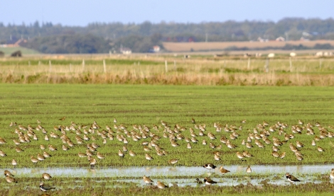 I vinterhalvåret er engene og markerne i det havskabte landskab på Vadehavskysten vigtige raste- og fødesøgningsområder for vadefugle som hjejler og viber. Også på Mandø kan disse arter ses i tusindvis, når de om foråret og om efteråret er på træk mellem ynglepladserne mod nord og vinterkvartererne mod syd. Foto: John Frikke ©