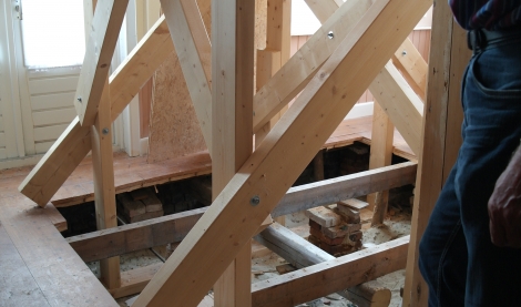 Reparation efter jordskælv og sikring mod nye: Mange steder i Groningen-området støder man på huse med kraftige afstivningsbjælker i træ og jern, som holder sammen på de nedstyrtnings-truede bygninger.