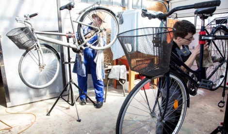 Brugte cykler samles ind til lejren, og cyklerne sættes her i stand af Lars Philipsen og Line Nissen på værkstedet Østerlund. Foto: Kim Toft Jørgensen