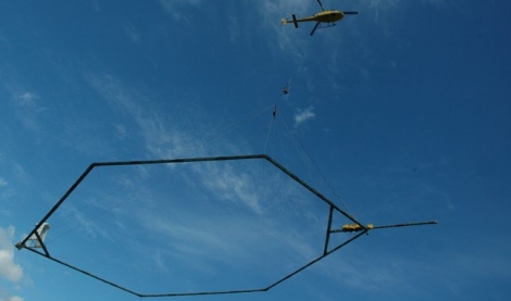 Så er de flyvende grundvandskortlæggere igen på vingerne. De svæver i en helikopter, der har fået et gevaldigt gyngestativ under skroget. Stativet kan ”kigge” under jorden og se, hvordan undergrunden er bygget op geologisk, og hvor godt grundvandet er beskyttet. Det ”skanner” jordens elektriske modstandsforhold ned til en dybde af ca. 100-200 meter.
